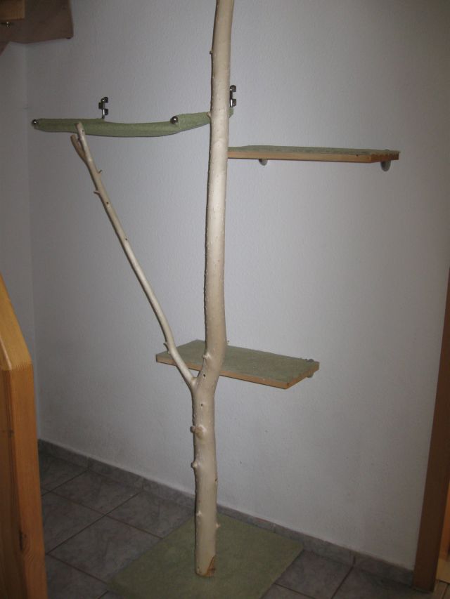 So, hier zeige ich Euch mal die neuste Entwicklung unseres Kratzbaumes... ich habe ein zweites Brett als Liegefläche angebracht, die Bretter mit großen Schrauben am Stamm befestigt, zur Stabilität und eine Bodenplatte untergeschraubt. Hinzu kommt noch eine selbstgenähte Liegemulde. Dazu habe ich zwei schwenkbare Gardinenstangen an die Wand geschraubt. Der Bezug besteht aus einem dicken Duschhandtuch, doppelt genäht. Dann habe ich noch eine Holzstange quer eingenäht, damit die Gardinenstangen nicht zusammenklappen und die Katze rauskippt Zwinker . Natürlich kann ich den Bezug abnehmen um ihn von Zeit zu Zeit zu waschen. Ich finde, es sieht ganz gut aus. Allerdings werde ich wohl noch Sisal oder Kokusband in Abständen um den Stamm wickeln, da er wohl doch recht glatt und hart ist, um sich richtig darin festzukrallen..