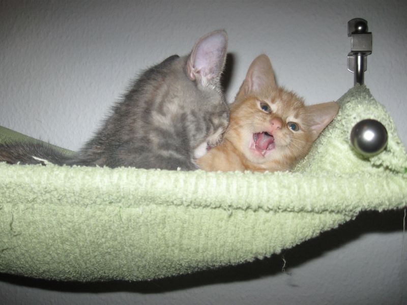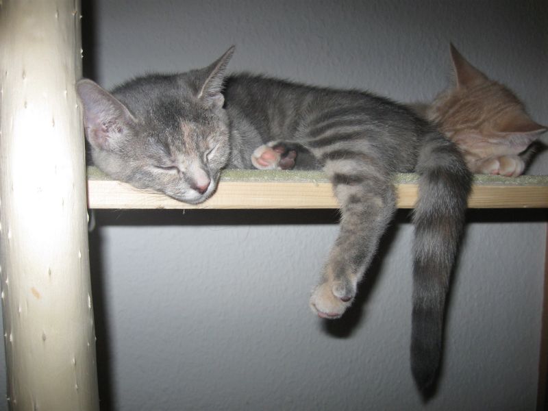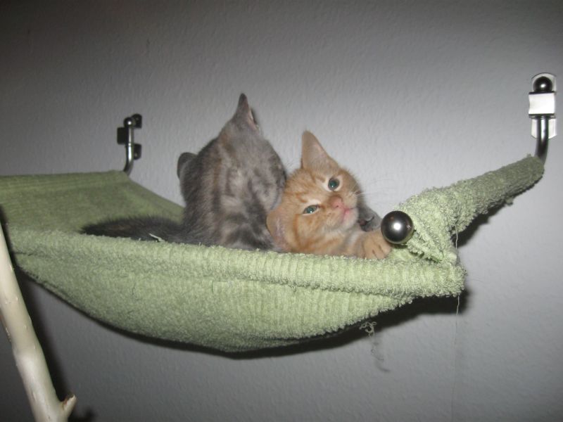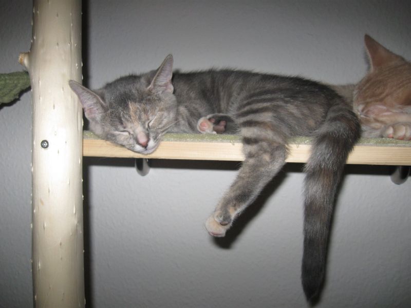 Kurzer Zwischenbericht : Wie bereits festgestellt, wollen unsere Katzen zwar gern den Stamm hoch, er ist aber dann doch zu glatt und ich werd in nächster Zeit den Stamm teilweise mit Sisal umbinden ( Fotos folgen). Aber, wenn man den Stamm nicht hochkommt, dann eben anders, so dachten es wohl meine Süssen. Ich denk, ich schau nicht richtig, gestern saß Anton auf dem oberen Brett und meine süße Ally hatte es sich in der Hängematte bequem gemacht. Wie haben sie das geschafft???? Ganz einfach, sie sind über die Treppe gegangen. Da sag noch mal einer, Katzen wären dumm Zwinker .