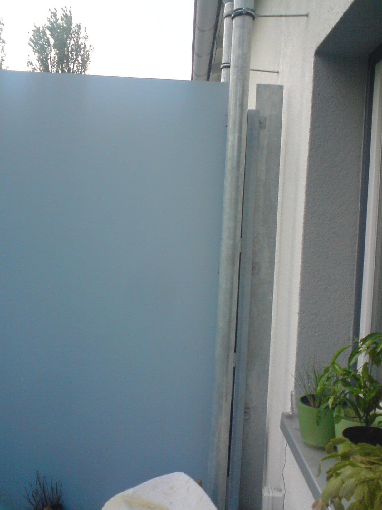 Hast Du denn links und rechts eine Trennwand und ist über Deinem Balkon ein weiterer oder ist da nichts mehr? Ich hätte vielleicht die eine oder andere Idee, aber dazu müßte ich doch ein bisschen mehr sehen. Wenn Du nämlich neben die Trennwände seitlich jeweils einen Pfosten machen könntest, wäre das was. Dann hätte ich auch eine Idee. Das Fallrohr alleine stellt in meinen Augen nicht wirklich ein Problem dar. Wenn dann eher die Befestigung der Pfosten, wenn Du nichts an die Fassade anbringen darfst.