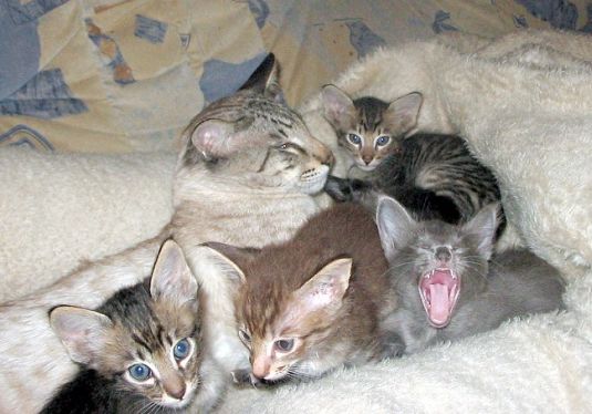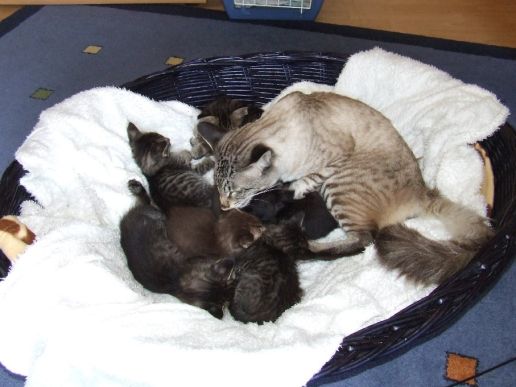 Die Geburt lief ohne Probleme. Laluna hat die Kitten ohne Probleme auf die Welt gebracht. Sie ist eine superliebe Mami und kümmert sich mehr als rührend um die Kleinen. Wir sind richtig stolz auf unsere Süße.