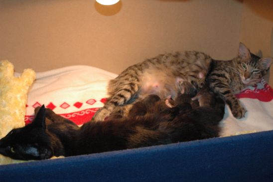 vielen Dank für die Glückwünsche. Es geht allen prächtig und Lune ist eine vorbildliche Mami. Cleo und Caruso, ebenso wie der frischgebackene Papa und auch Mister, haben die Kleinen auch schon begrüßt. Raffi und Caruso waren allerdings noch etwas verwundert und nahmen erstmal Reisaus. Mister und Cleo hingegen haben die Neuankömmlinge erstmal liebevoll beschnuppert.