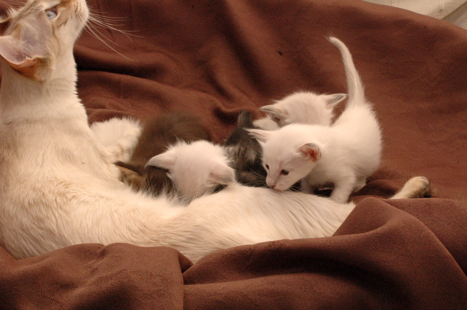 Also wegen der Farben denke ich, dass das eine Mädchen( hinten links) auf jeden Fall seal ist, wahrscheinlich seal ( silver?) tabby. Die anderen drei Mädels werden chocis oder ganz eventuell auch lilac sein. Aber ebenfalls tabby denke ich mal, auch wenn an den Schwänzchen gar keine Streifen zu erkennen sind, noch nicht.