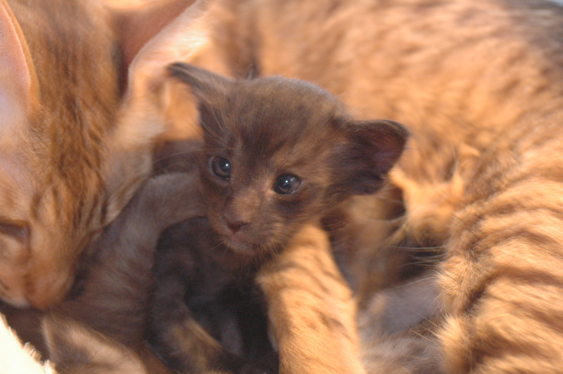 Den Kleinen und Temhit geht es super. Ursprünglich habe ich auf drei oder vier Kitten getippt. Aktuell lasse ich mich noch überraschen, ob vielleicht doch noch ein Nachzügler/in kommt.