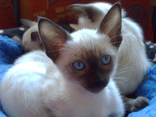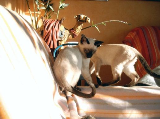 Uschi...auf der Couch vorne ist Thaikater Belenus und dahinter sieht man grad noch Thaikatze Birkita laufen , nach der TICA hätte gerade Birkita auch Siamesenpapiere bekommen...aber da sie eben viel Thaiblut hat, bleibt sie auch Thai.