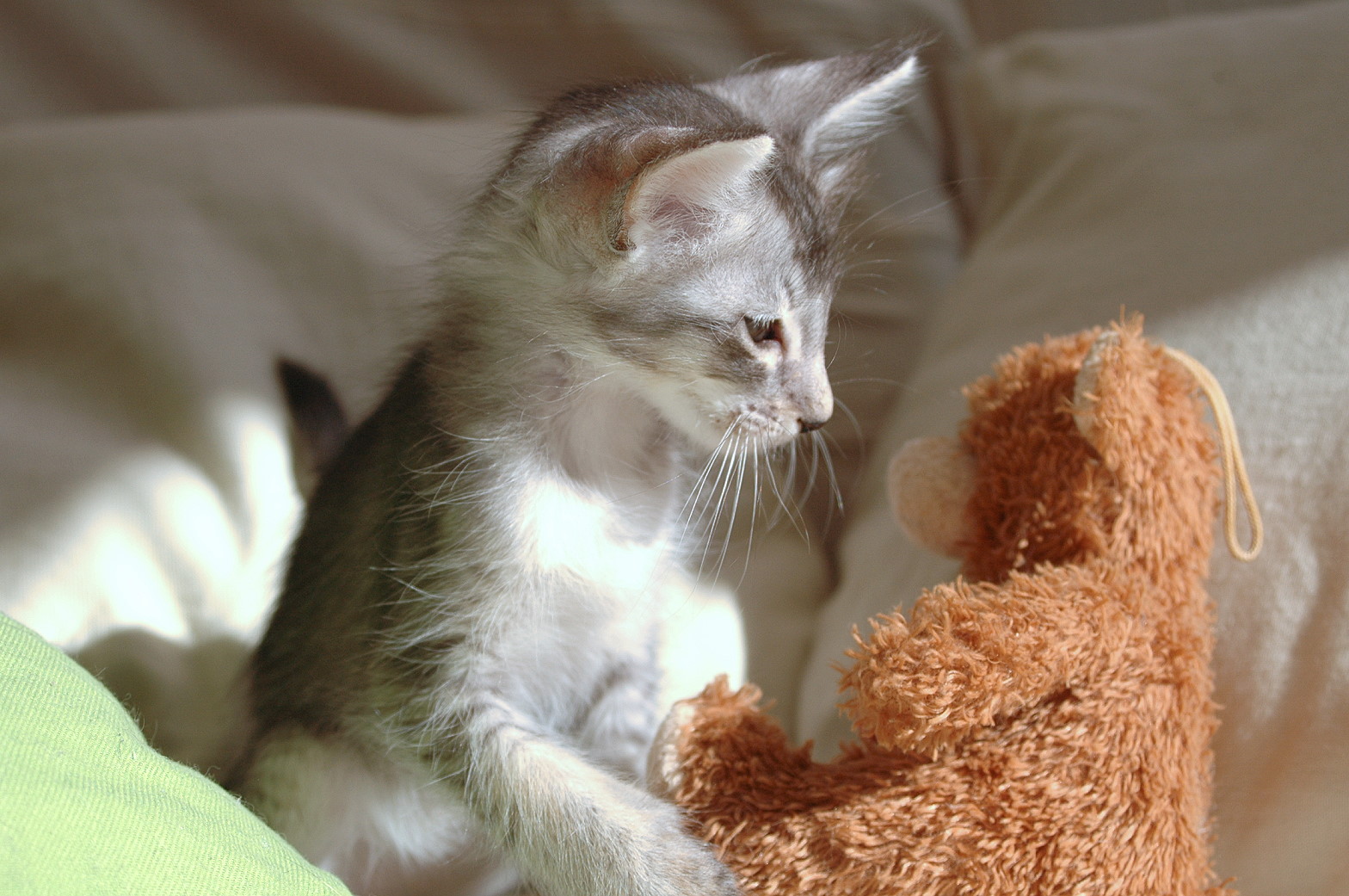Ich meinte damit das Foto, wo sich das Riesenbaby zwischen die Kleinen geschummelt hat und an der Katze nuckelt :-)